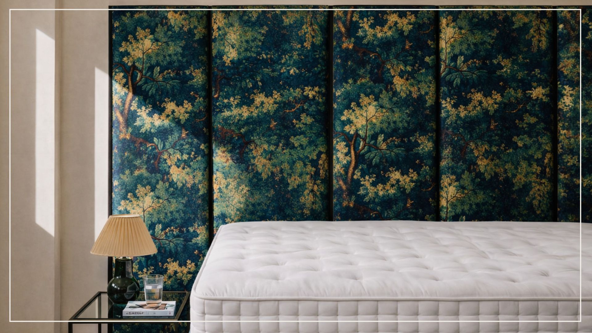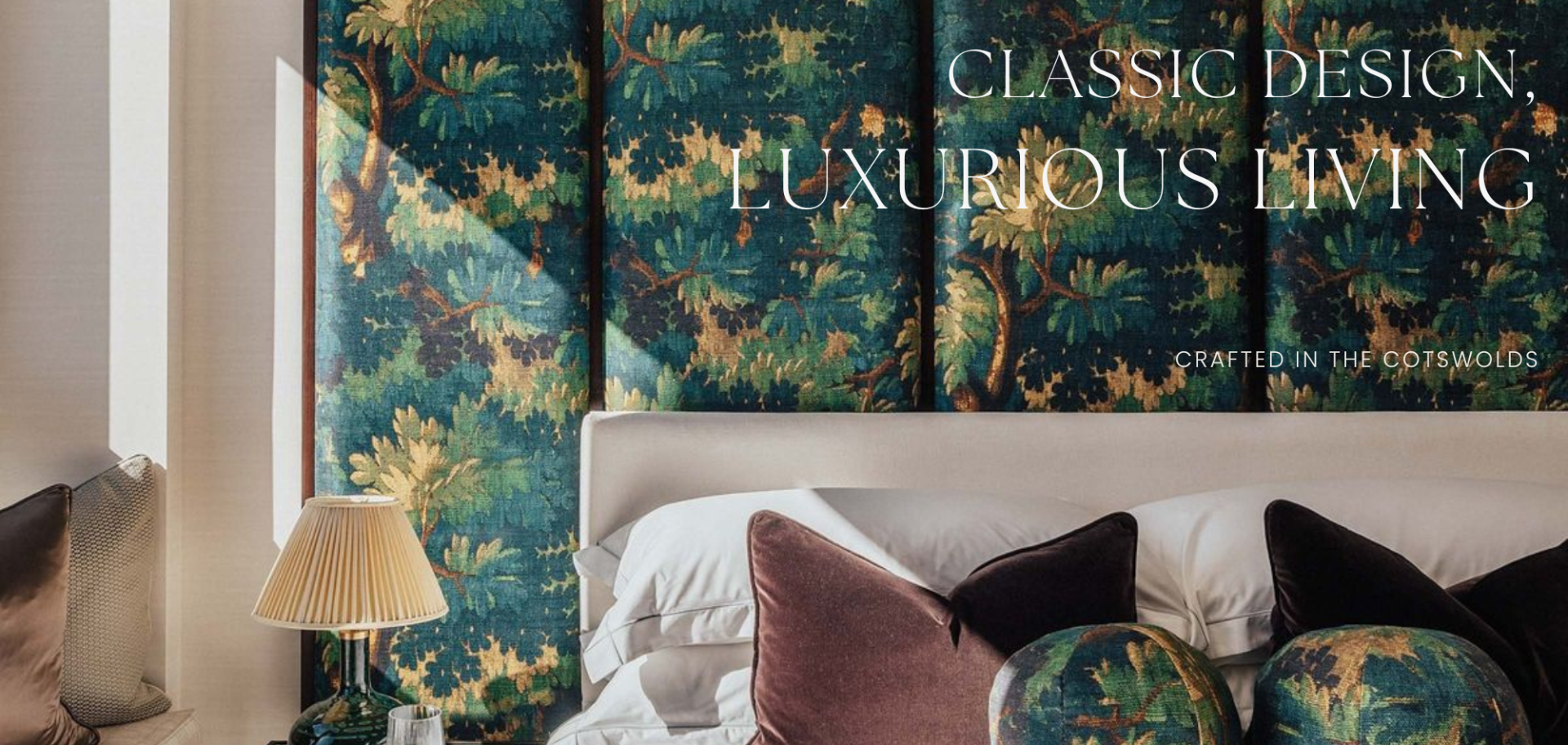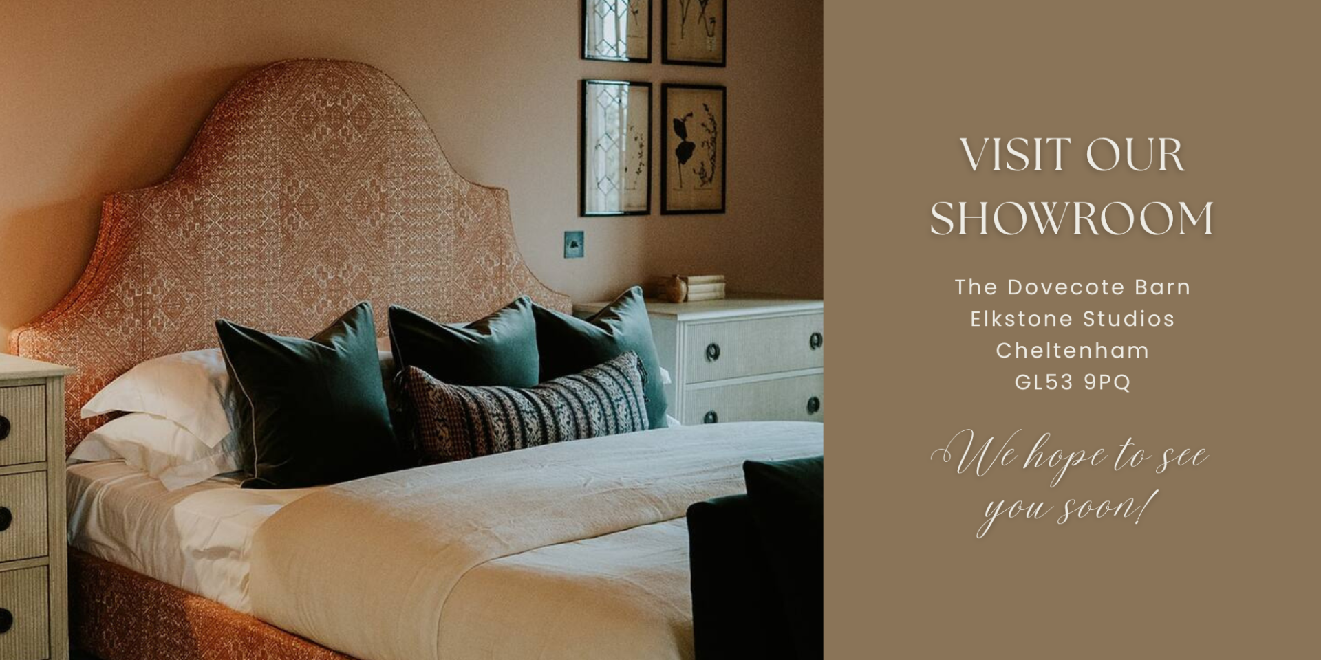 Elizabeth Bed in chutney velvet, wooden feet, styled with cream and charcoal cushions