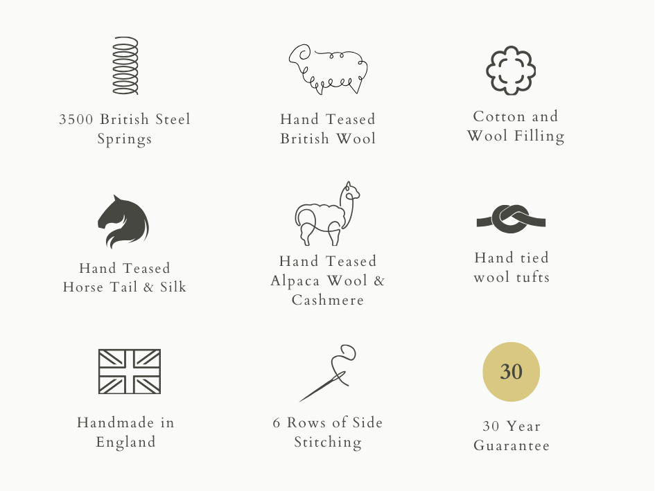 - 100% Natural fillings of blended cotton and British wool, hand teased loose sheep and alpaca wool, silk, cashmere and horse hair