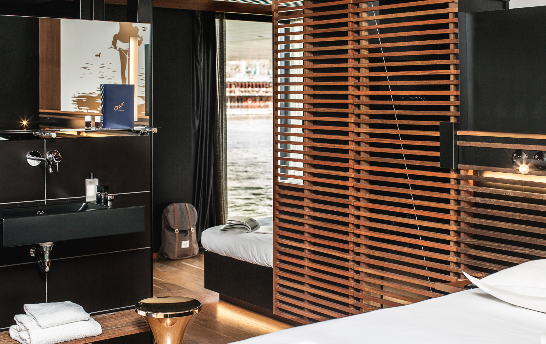 A striking example of this design is the lounge ceiling, covered with 8,800 suspended squares of metal which reflect the movement of the Seine, while also vibrating as the boat gently shifts with the river. Porthole curtains also subtly allude to waves. In the reception area, the designers sourced a 250-year-old piece of wood, weathered as if it had been transported by the water, and embedded it—like a precious gem—on top of the copper reception desk. The hotel experience is distinctly Parisian, minus the urban intensity. There’s a calming effect as the currents flow beneath the windows of the 58 guest rooms, particularly the two Horizon suites positioned at the bow of the boat.