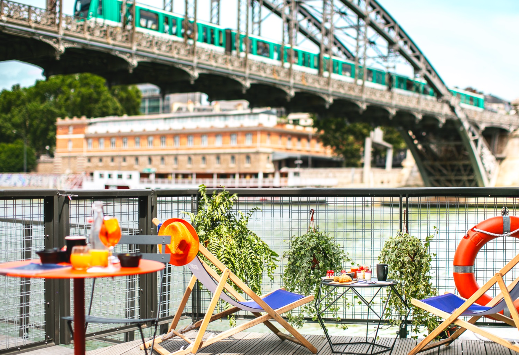 The largest boat docked in the French capital, Off Paris Seine is situated near the Gare d’Austerlitz, a cobblestone’s throw from the Cité de la mode et du design (a complex devoted to fashion and design) in the 13th arrondissement. This is a neighborhood in the midst of a trendy transformation. A hot bed for street art and new, eco-friendly architecture, the 13th is on the rise as the quartier du jour. In the summer months, the quays come to life with pop-up bars and paillottes (ephemeral beach clubs).