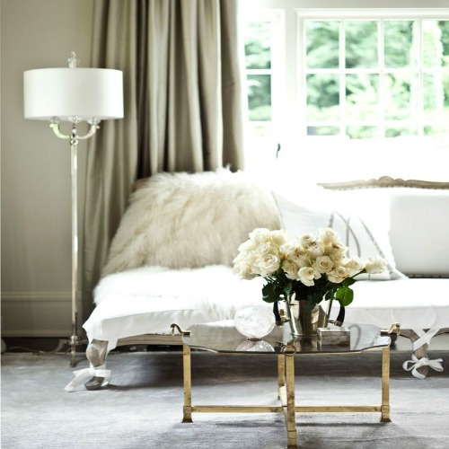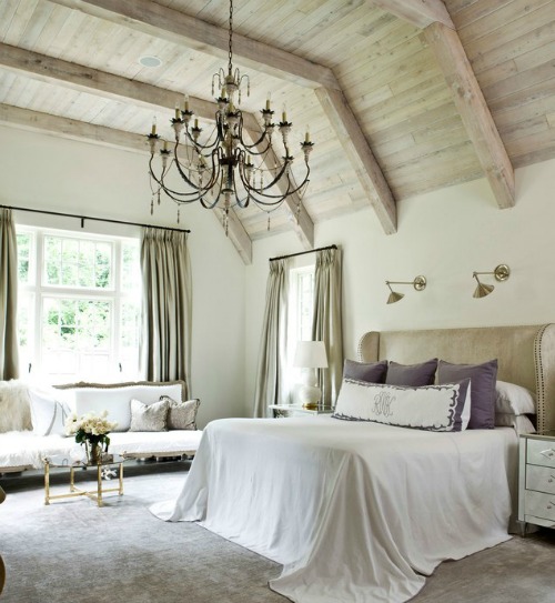 Warm it up. An extra-large bedroom can be at odds with the homey feeling most people want in a sleeping space. Kasler turned this soaring room into a “soothing envelope” using a palette of quiet neutrals, from the lime-washed ceilings to the almost platinum-hued rug. The casual spill of the bedding also creates a more relaxed vibe.