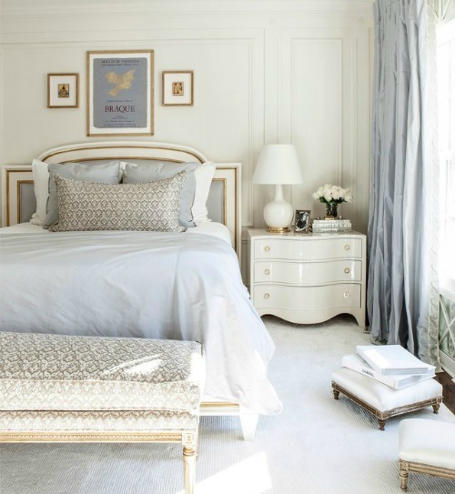 Stay consistent. Kasler’s own bedroom palette was inspired by the vintage print that hangs above her bed. “What I love about my bedroom is that it’s essentially just two colors: this unusual periwinkle-blue and white,” she says. Keeping within a simple color scheme allowed her to experiment with furniture styles while still creating a cohesive space.